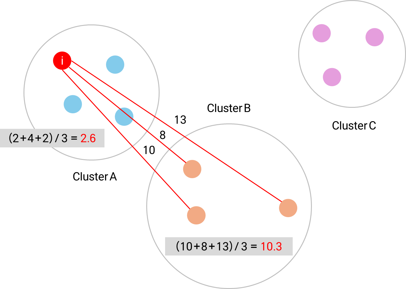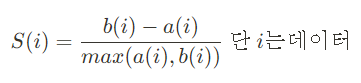 b(i) - a(i) : 데이터 i에 대해 얼마나 떨어져 있는지 측정 (클수록 멀리 떨어짐)