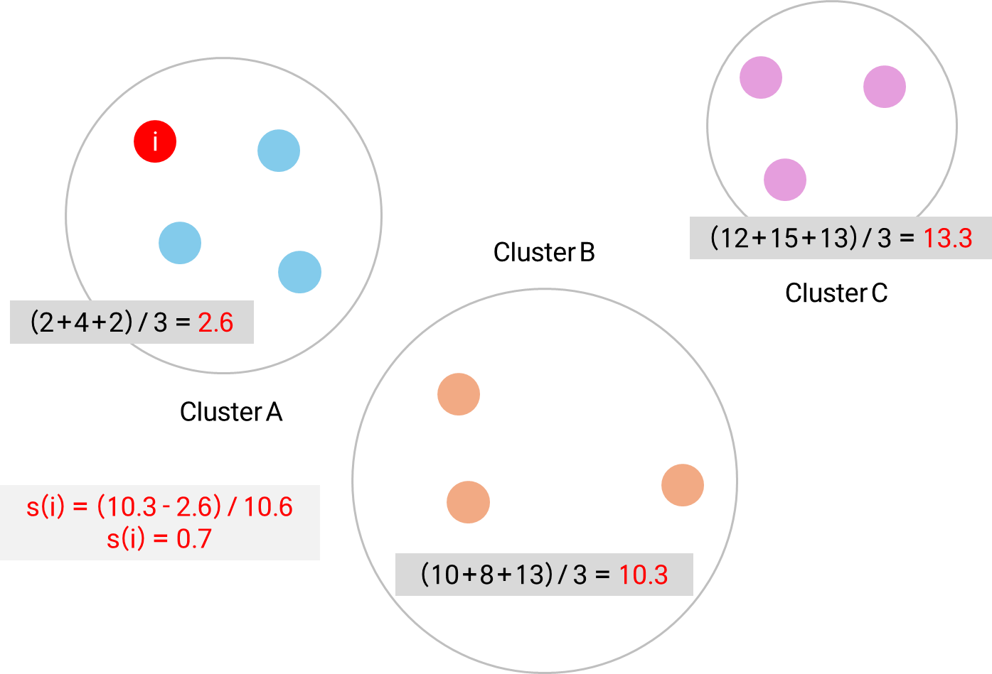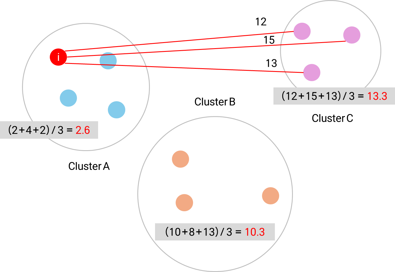 군집 A 와 인접한 군집은 군집 B 이기 때문에 군집 A = a(i) 군집 B = b(i) 로 정의해서 s(i) 를 계산해줍니다.