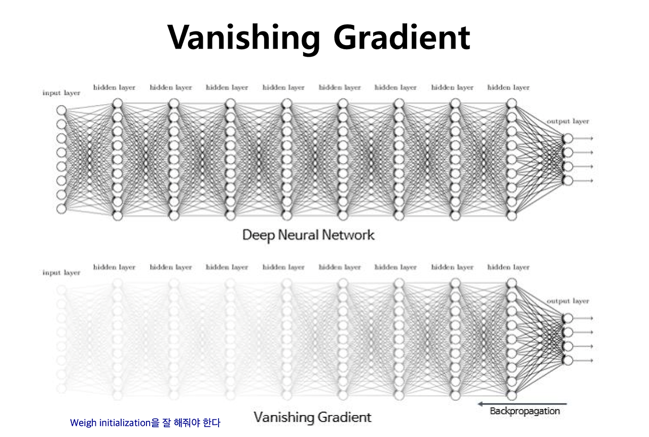 인공 신경망 학습 과정에서 입력 → 출력 방향의 순전파 propogation 과정과 출력 → 입력 방향의 역전파 backpropagation 과정을 진행하는데 후자의 경우 하위 레이어로 갈수록 오차의 기울기가 점점 작아져 가중치 업데이트가 안 되는 현상