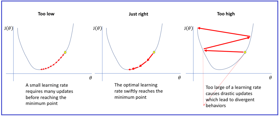 step size 알파가 너무 작거나 너무 클 경우 아래 이미지와 같이 가중치를 구하는데 방해가 될 수 있습니다.