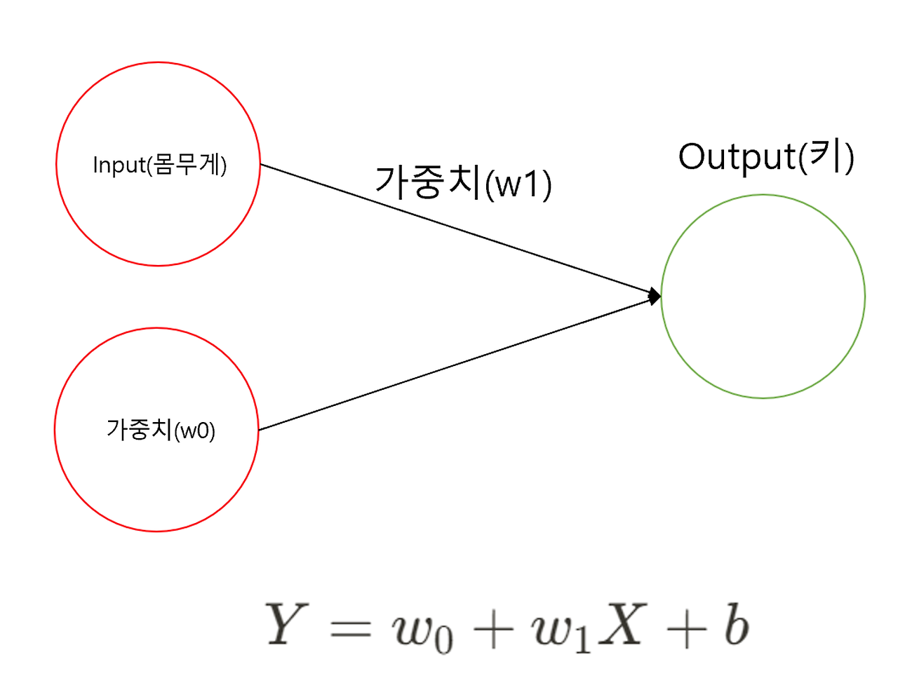 앞서 선형회귀에서 키와 몸무게를 예제 데이터를 퍼셉트론으로 표현하면 아래와 같습니다.