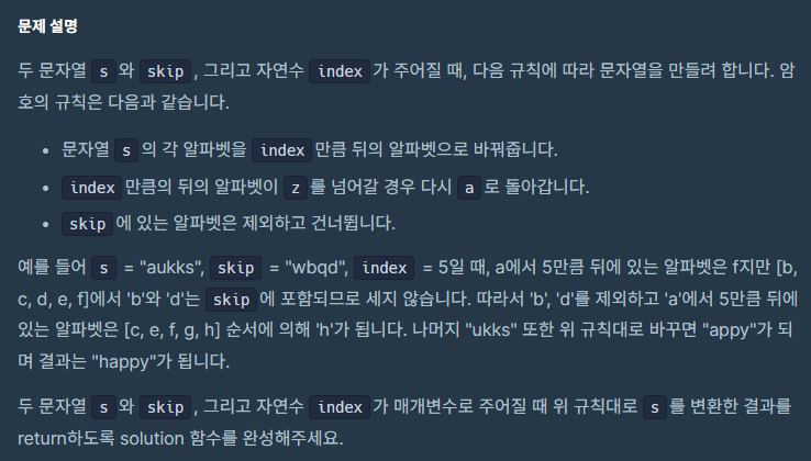 우선 s 인덱스 카운트가 원활하게 되도록 alphabet 문자열 생성 후 skip 에 포함된 문자를 제거해주는 작업을 해줍니다.