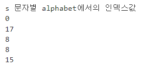 alphabet.find(s[i]) # alphabet에서 s 문자별 인덱스값 찾기