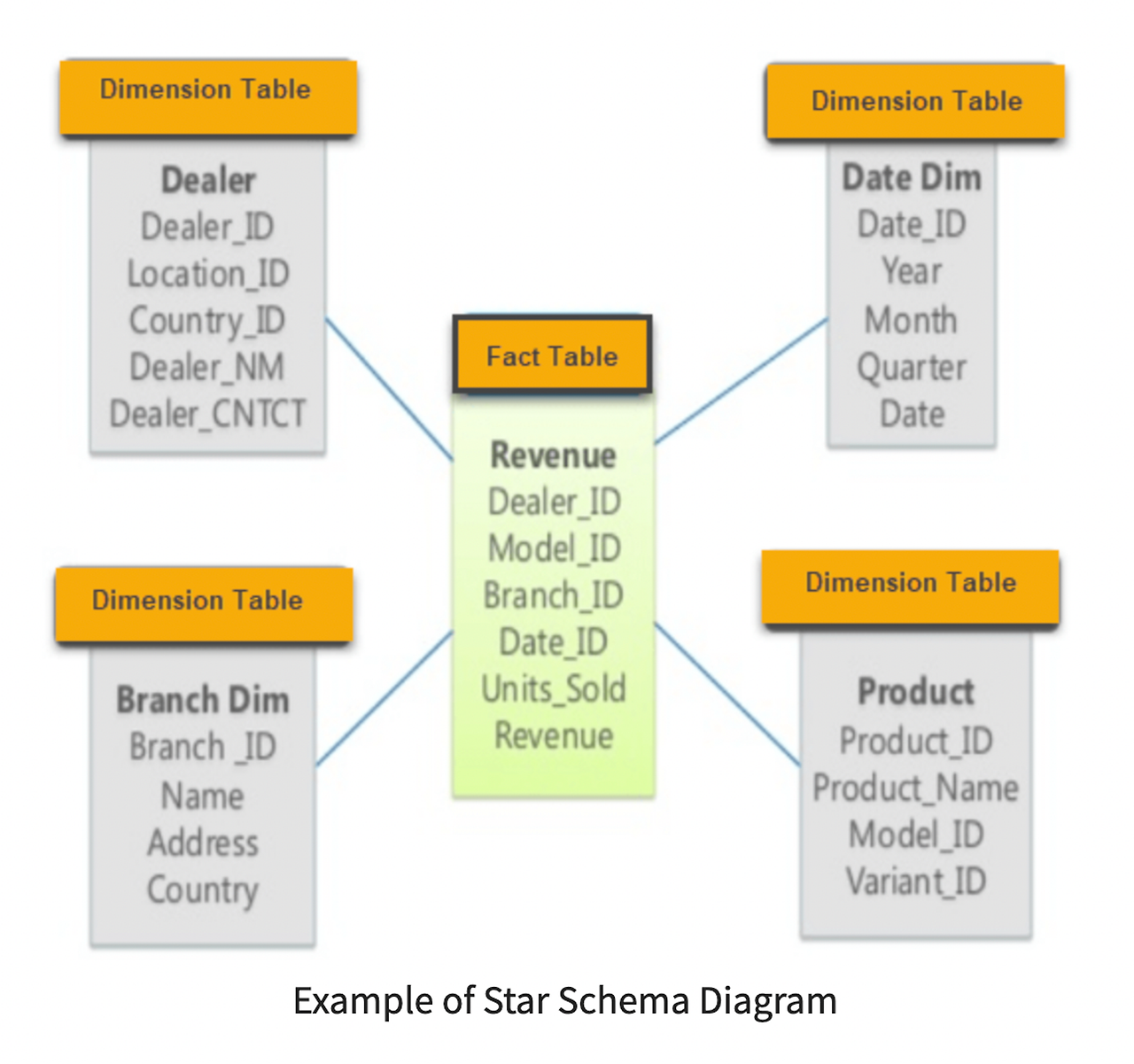 | Star 스키마 | - 가장 간단하고 일반적으로 사용되는 유형의 데이터 웨어하우스 스키마 - fact table 중심으로 dimension table이 둘러싸고 있는 별 모양 구조 - 주제별로 정리되어 있음 (date, product 등) - dimension table 은 fact table 의 차원을 설명하며 FK로 연결됨 - 비즈니스 요구사항에 더 적합하며 간단하고 빠르게 쿼리 수행 가능 - 일대일 관계만 허용 |