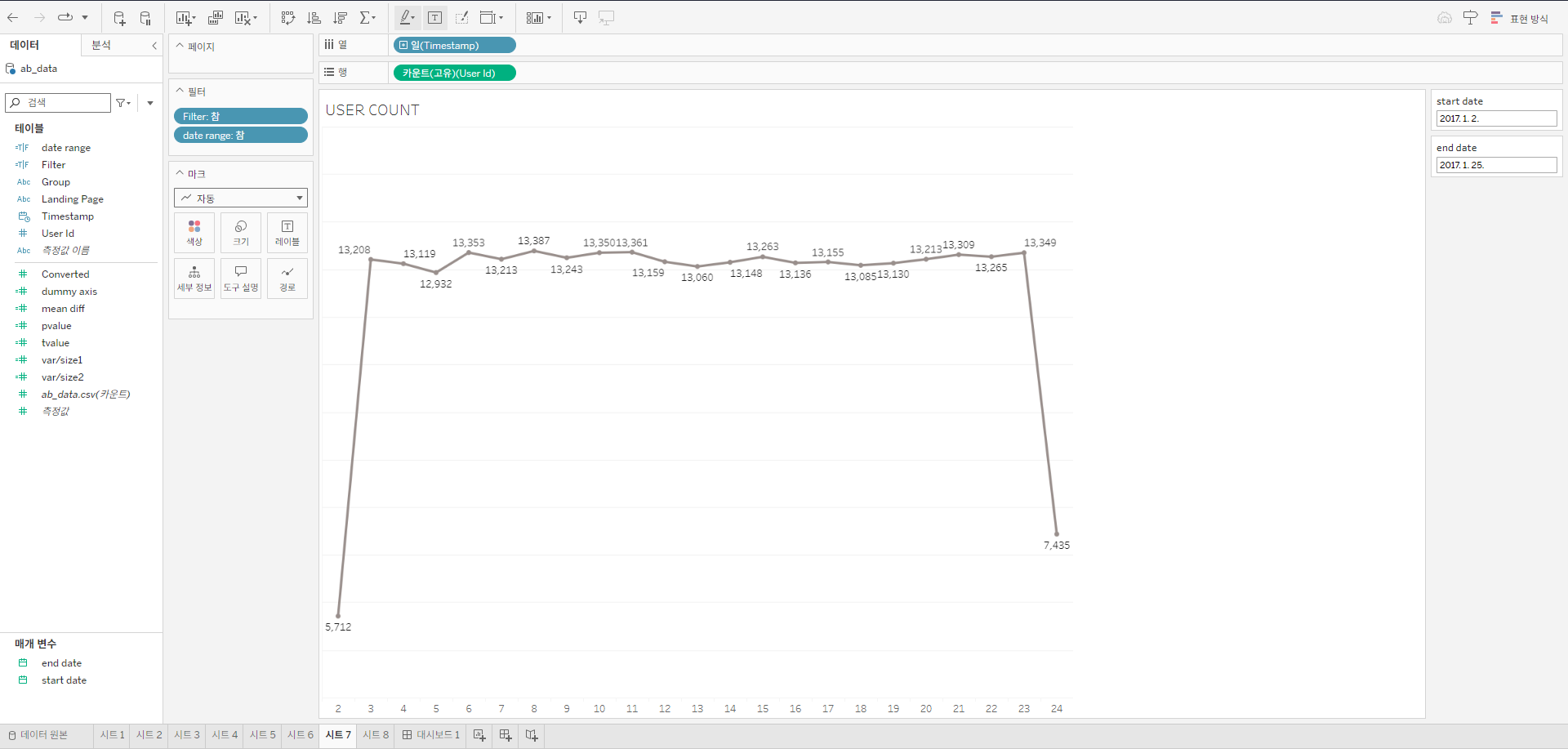 시트 7: start date와 end date 매개변수 필터 만들기, 유저 카운트