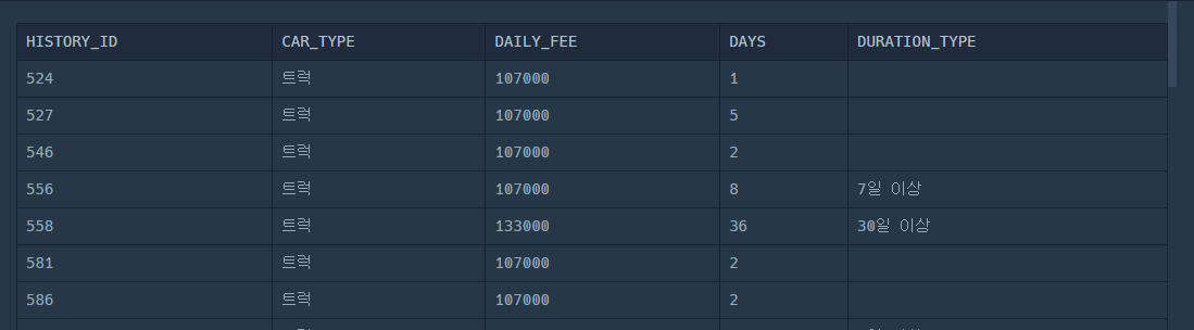 이때 필요한 칼럼은 HISTORY_ID, CAR_TYPE, DAILY_FEE, DAYS, DURATION_TYPE 이며 결과물은 아래와 같습니다.