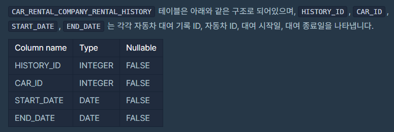 다음은 어느 자동차 대여 회사에서 대여 중인 자동차들의 정보를 담은 CAR_RENTAL_COMPANY_CAR 테이블과 자동차 대여 기록 정보를 담은 CAR_RENTAL_COMPANY_RENTAL_HISTORY 테이블과 자동차 종류 별 대여 기간 종류 별 할인 정책 정보를 담은 CAR_RENTAL_COMPANY_DISCOUNT_PLAN 테이블 입니다.