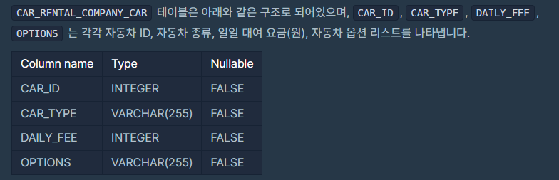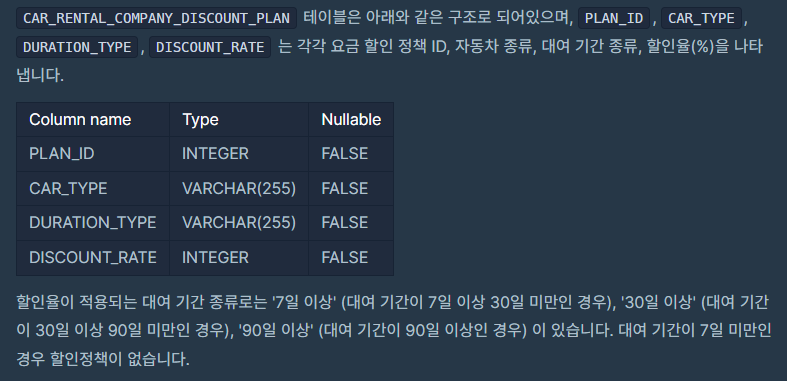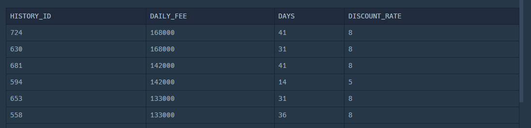 → 처음 코드 작성 시 CAR_TYPE 를 넣지 않고 DURTAION_TYPE 로만 할인 테이블과 연결했더니 할인율에 모두 -1이 된 이상한 결과물이 나왔습니다. 테이블 JOIN 시 어떤 값에 대해서 연결해줄지 항상 제대로 생각해야 하는데 매번 한두개씩 놓칩니다.