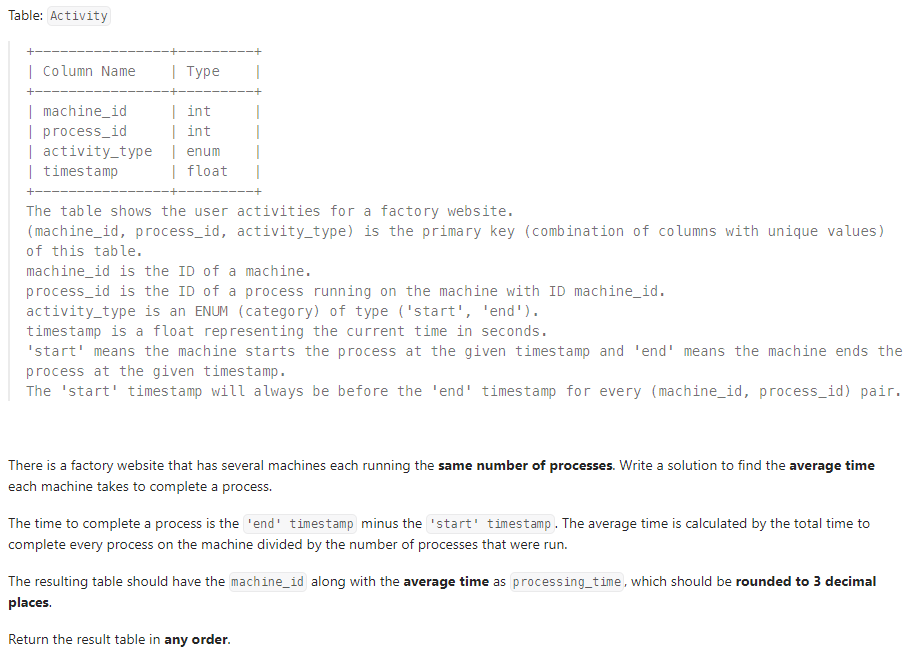 SELECT a1.machine_id, round(avg(a2.timestamp-a1.timestamp), 3) as processing_time
