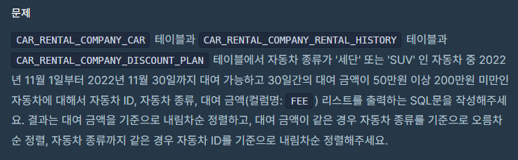 프로그래머스 | 특정 기간동안 대여 가능한 자동차들의 대여비용 구하기 (MySQL) 본문