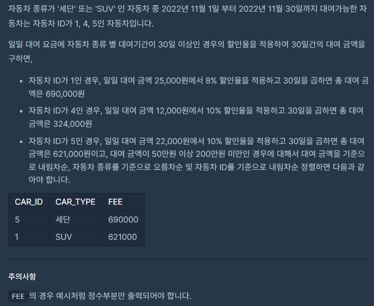 편의상 조건문을 SELECT 에 넣었지만, 최종 코드에서 WHERE CAR_ID IN (서브쿼리) 로 써야 하기 때문에 HAVING으로 넣어줍니다.