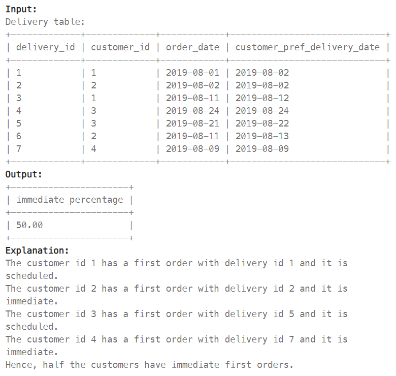 SELECT ROUND(AVG(ORDER_DATE=CUSTOMER_PREF_DELIVERY_DATE)*100,2) AS IMMEDIATE_PERCENTAGE