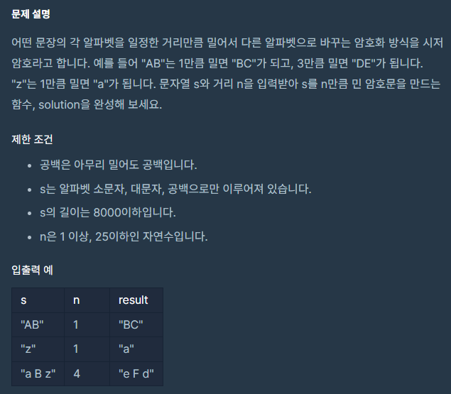 # s[i]는 (s[i]의 ASCII 값 - 'A' 의 ASCII 값 + n) [즉 j] 을 26으로 나눈 나머지에