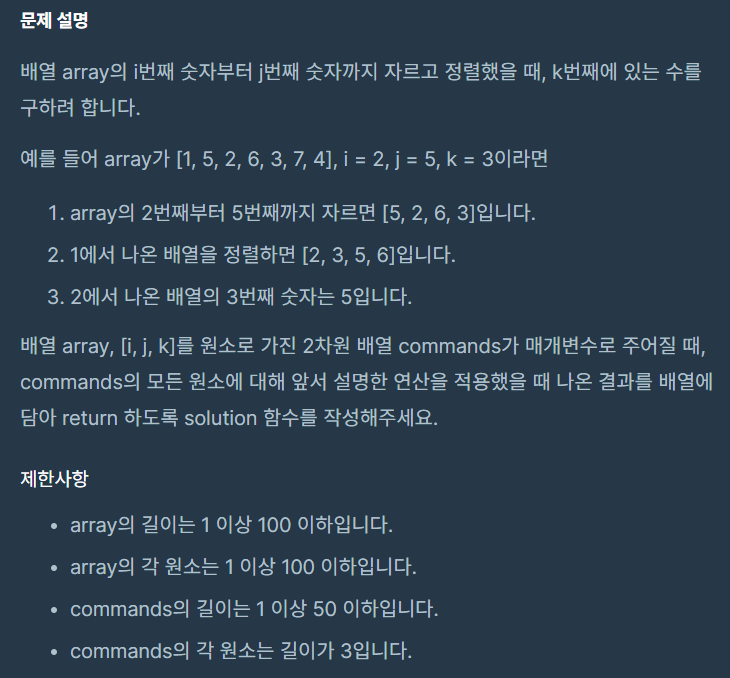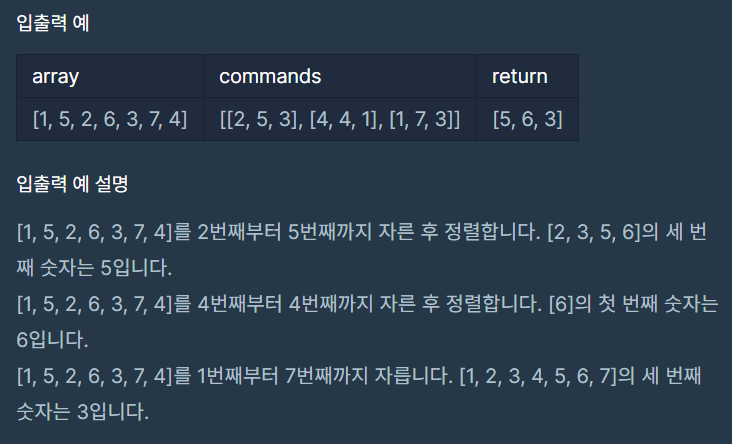 그리고 num 안의 b 에 대해 정렬을 해준 후 k 에 해당하는 값을 answer 에 넣어줍니다.