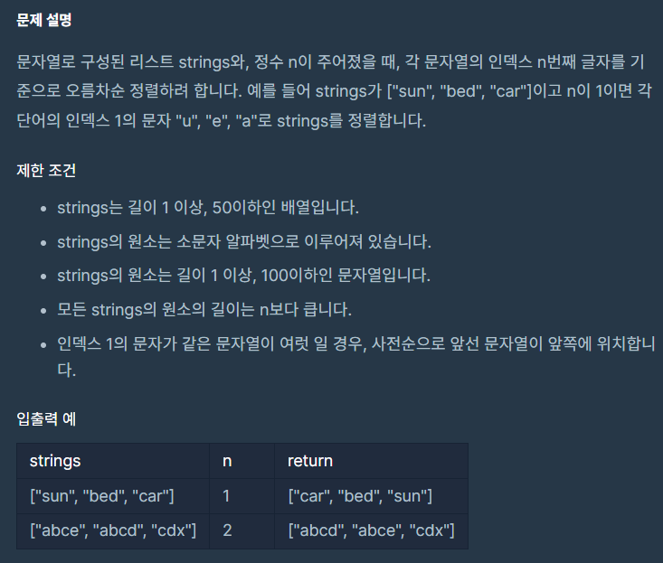 이때 문제에서 strings 의 i 에 대해서 i[n] 이 정렬되는 순서를 기준으로 전체 strings 의 인수들을 정렬하고 싶은 거기 때문에 i[n] 그리고 그 값이 같을 경우 i 를 key 기준으로 두고 sort 되게 합니다.