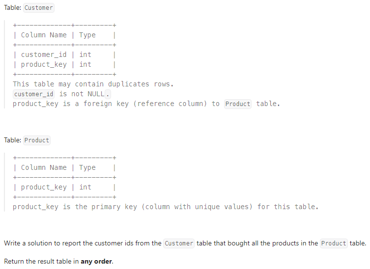 이때 Product 테이블의 값은 모두 distinct 한 값이란 점을 감안하면, customer_id 기준 각 product_key 의 개수와 Product 테이블 값의 개수가 일치한다는 말로 해석할 수 있습니다.
