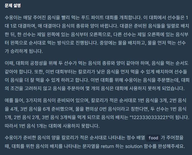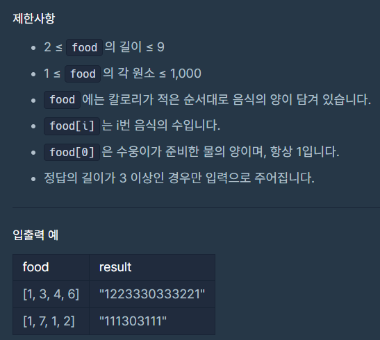 우선 1~len(food)의 숫자 i 에 대해서 food[i] 번 음식이 i 번 반복되도록 하는 패턴을 짜줍니다.