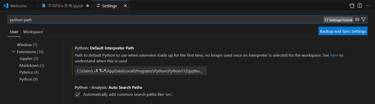 마지막으로 VS Code 설정에서 python path 가 올바르게 저장되어 있는지도 확인해줍니다. (거의 끝남)