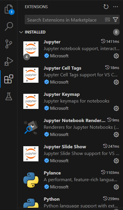 Extenstions 에서 Python, Jupiter 를 설치해줍니다.