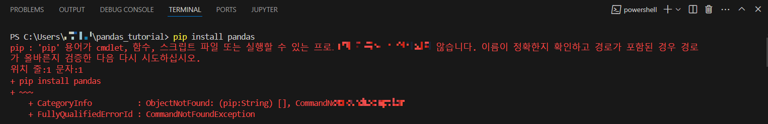 실행 시 Pandas 설치가 안 되어있기 때문에 아래와 같은 오류가 뜹니다.