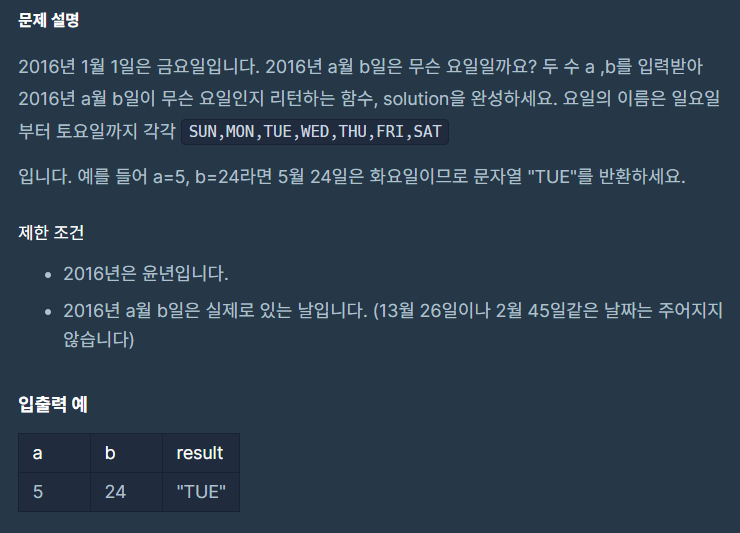 즉, 요일과 월별 일수를 나열한 리스트 2개를 작성해주고 여기서 값을 추출해서 계산해주는 방식으로 풉니다.
