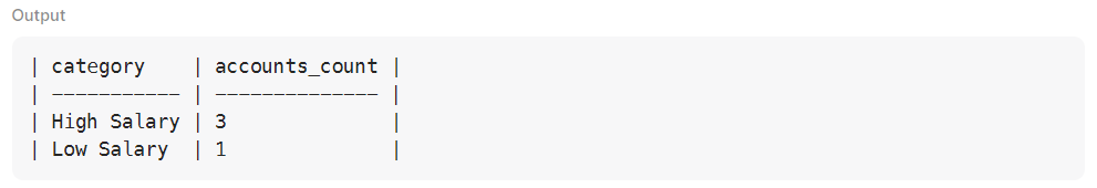 select 'High Salary' as category, sum(income>50000) as accounts_count