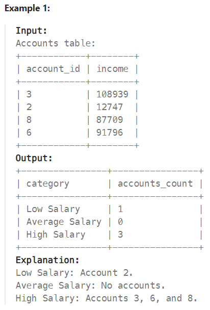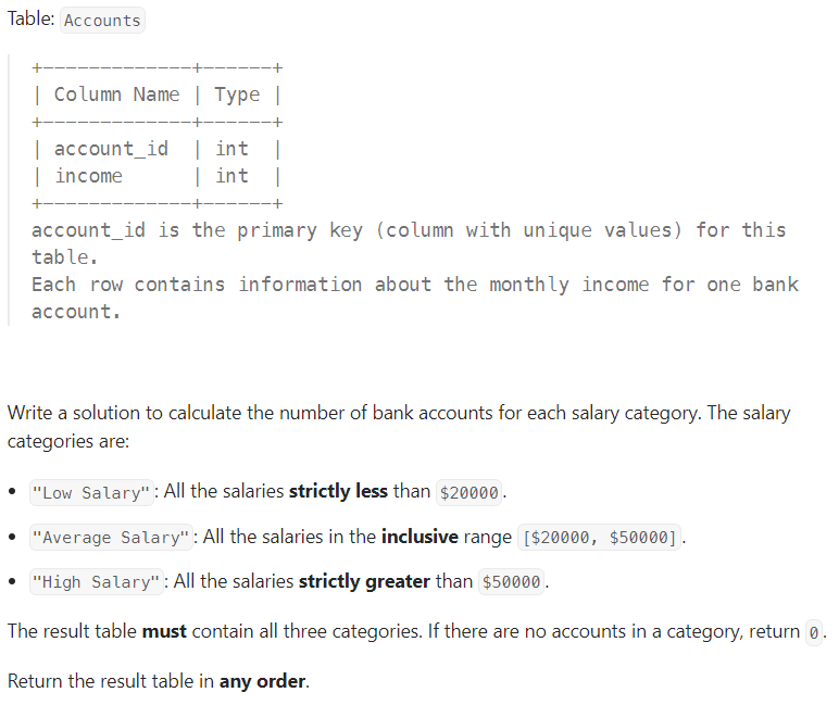 LeetCode 리트코드 | 1907. Count Salary Categories (MySQL) Union 본문