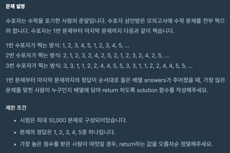 각 수포자에 대해 answers[ i ] 와 g[ i % 리스트 길이] 를 비교해줍니다.