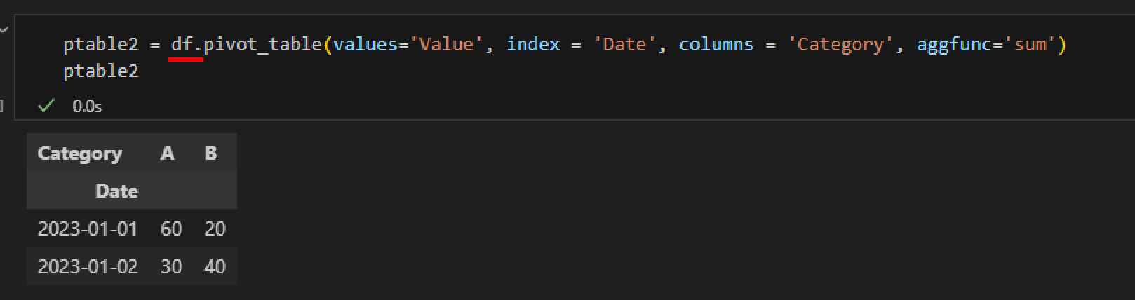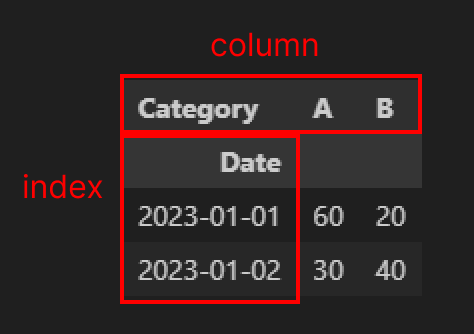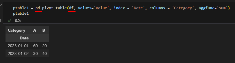 ptable1 = pd.pivot_table(df, values='Value', index = 'Date', columns = 'Category', aggfunc='sum')