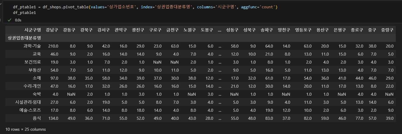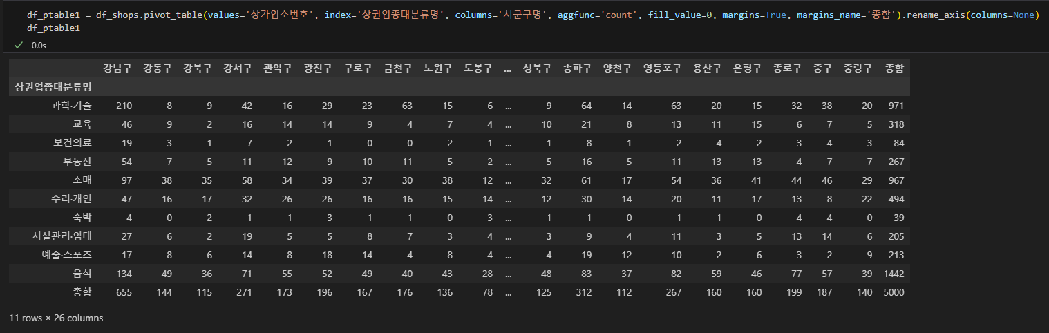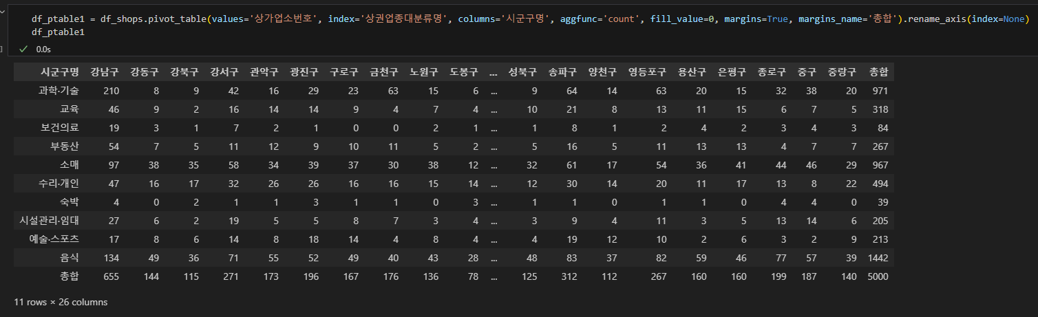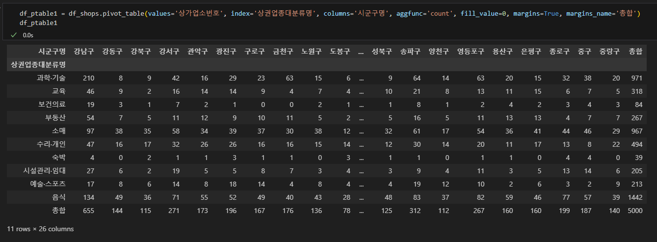서울시내 상가들을 업종별, 구별로 비교해 볼 수 있는 피벗테이블을 만들어봅시다.