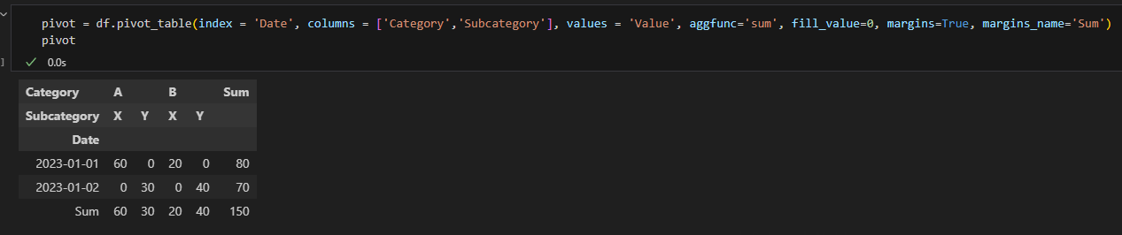 pivot = df.pivot_table(index = 'Date', columns = ['Category','Subcategory'],values = 'Value', aggfunc='sum')