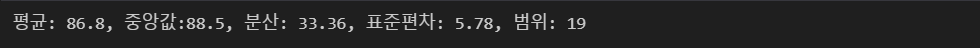 print(f'평균: {mean}, 중앙값:{median}, 분산: {variance}, 표준편차: {std_dev}, 범위: {data_range}')