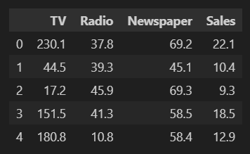 data = {'TV': [230.1, 44.5, 17.2, 151.5, 180.8],