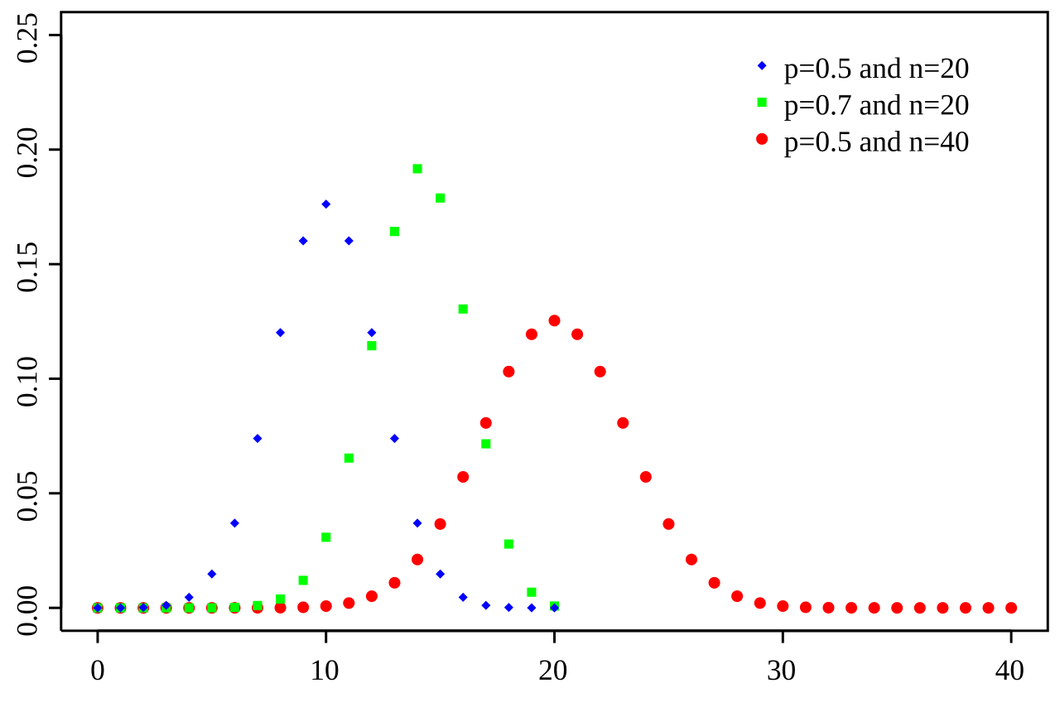 - 독립시행 실험 횟수 n 과 성공 횟수의 확률 p 로 정의됨