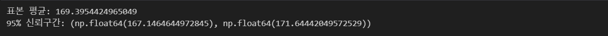 실제 표본 평균이 95% 신뢰구간 안에 있는 것을 확인할 수 있습니다.