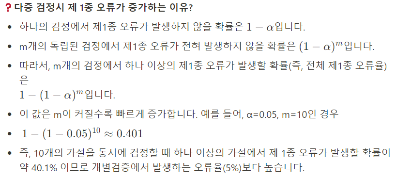 - 본페로니 보정: 유의수준을 더 좁게 잡기, 유의수준/ p_value의 길이