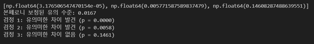 print(f"본페로니 보정된 유의 수준: {adjusted_alpha:.4f}")