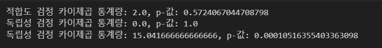 print(f"독립성 검정 카이제곱 통계량: {chi2_stat}, p-값: {p_value}")