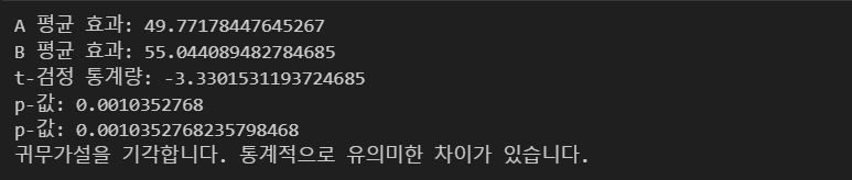print("귀무가설을 기각합니다. 통계적으로 유의미한 차이가 있습니다.")