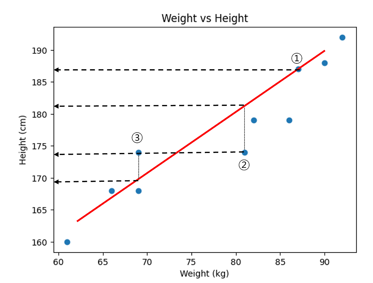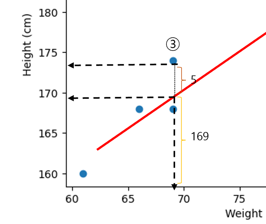 - ③번 실제 데이터: 174, 예측 데이터 : 169 → error: +5