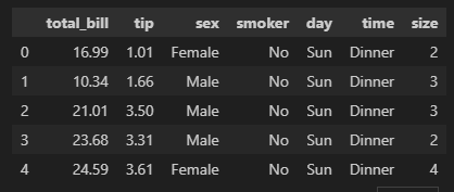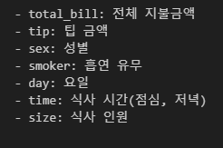 이번 실습에서 사용할 데이터는 Seaborn 라이브러리에 기본 내장된 tips 데이터로, 아래와 같은 구성입니다.