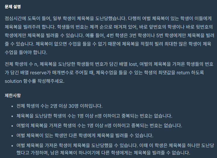 우선 마지막 제한사항을 보면 여벌 체육복이 있는 학생이 도난당했을 경우, 해당 학생은 다른 학생에게 옷을 빌려줄 수 없게 된다는 조건이 있습니다.